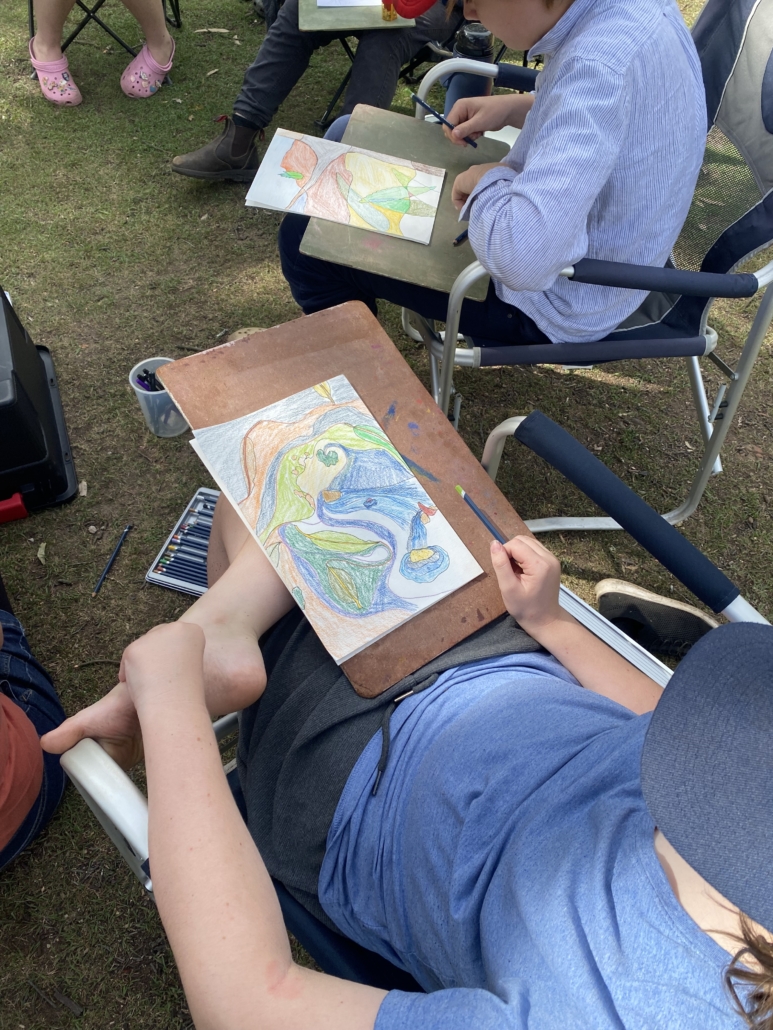 • Peeking over student’s shoulders while they worked away in charcoal (made in the previous nights fire), pencil and watercolour